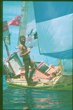 Serge se había construido él mismo su barco, de aluminio, y lo hizo a medida. Ya tenía experiencia en construir otros barcos, y hasta su propia bicicleta de niño, en el taller de metalurgia de su padre. No tenía presupuesto para un barco mayor y pensó que el punto clave no era el tamaño sino la seguridad. Por eso se hizo un velero insumergible, autoadrizable (¡para 3,6 metros de eslora tenía 1,5 metros de quilla!) y que se pudiera manejar siempre, en cualquier condición meteorológica, desde el interior de la cabina. A cambio el espacio de estiba era mínimo pues el barco era poco más que su cama rodeada de algún mueble y cajón de estiba: De hecho no tenía bañera y los winchies estaban al revés: situados en cubierta pero con las manivelas en su parte inferior, colgando del techo de la camareta. Podía izar y arriar las velas, tomar los rizos y manejar las escotas desde el interior: El precio que tuvo que pagar por esa seguridad es que dió la vuelta al mundo sentado en la misma posición (la que veis en el esquema anterior), muchas veces con los cojines mojados, lo que se tradujo en muchos episodios de llagas y forúnculos en el trasero que le hicieron la vida imposible, y la atrofia de los músculos de las piernas en las travesías oceánicas (varias semanas sin andar). Además cuando sufría temporales en los mares cálidos debía navegar con la camareta cerrada para que no entrasen las olas, con lo que el barco se convertía en una sauna y tuvo muchas dermatitis por el calor. Otro de los inconvenientes inesperados es que como las olas barrían constantemente la cubierta, le salían algas e incrustaciones no sólo por debajo de la flotación sino también por encima, con lo que los pequeños paseos por la cubierta para pescar, asearse o hacer de vientre eran un ejercicio de patinaje. A cambio las ventajas de un barco pequeño fueron muchas. Siempre tenía sitio en las marinas, y en muchas de ellas le hicieron servicios especiales o le dejaron amarrar gratis. Si no había sitio en los pantalanes podía quedarse en la escalera de los anexos, porque en realidad no era más grande que las zodiac de los otros veleros. Al puerto de Cayenne llegó para carenar y resultó que no tenía rampa de varada. Una draga que estaba limpiando el río sacó al barco del agua con su grúa, le posó en su cubierta, donde pudo limpiarlo y pintar los bajos y la misma grúa le devolvió al agua. Varó en varias ocasiones pero al ser el barco de aluminio consiguió sacarlo de las varadas sin problemas. En una de ellas, que el mar le había dejado muy alto en una playa, en lugar se salvar la varada por el mar lo hizo por carretera: una grúa le puso en el remolque de un todoterreno y le reflotaron en el puerto. La inventiva de Serge no tenía límites. Cada vez que pescaba un atún o una dorada grandes por el sistema clásico de la cacea se veía obligado a limpiarlo, secarlo o envasarlo al vacío, lo que con los medios de a bordo era más bien difícil (tenía una cocinita de alcohol que en dos ocasiones le produjo un incendio). Entonces se fabricó un fusil submarino con el bichero para cazar a los peces piloto que siempre nadan bajo los barcos, que son de tamaño más adecuado para la ración del día. Así no tenía que conservarlos y los tenía siempre frescos. La escasez de espacio generó también algunas situaciones curiosas. Por ejemplo, en el Canal de Panamá es obligatorio que embarque un práctico del Canal y 4 amarradores, pero en aquél barquito era imposible y lo pasó solo, lo que ha debido ser el único caso en la historia del Canal. Y como muchos trasmundistas se enemoró por el camino, en Sudáfrica, pero su chica no pudo acompañarle el resto del viaje porque no cabía a bordo, o sea que fue por otros medios hasta Australia para esperarle allí. Con esa vuelta al mundo Serge batió un récord que, según creo, aún no ha sido superado. Después ha seguido navegando y el la última foto podéis verle con sesenta y tantos años visitando su antiguo barco, que ahora está expuesto en un museo. También podéis ver el detalle del enrollador de botavara para la vela mayor. Un personaje digno de conocer.