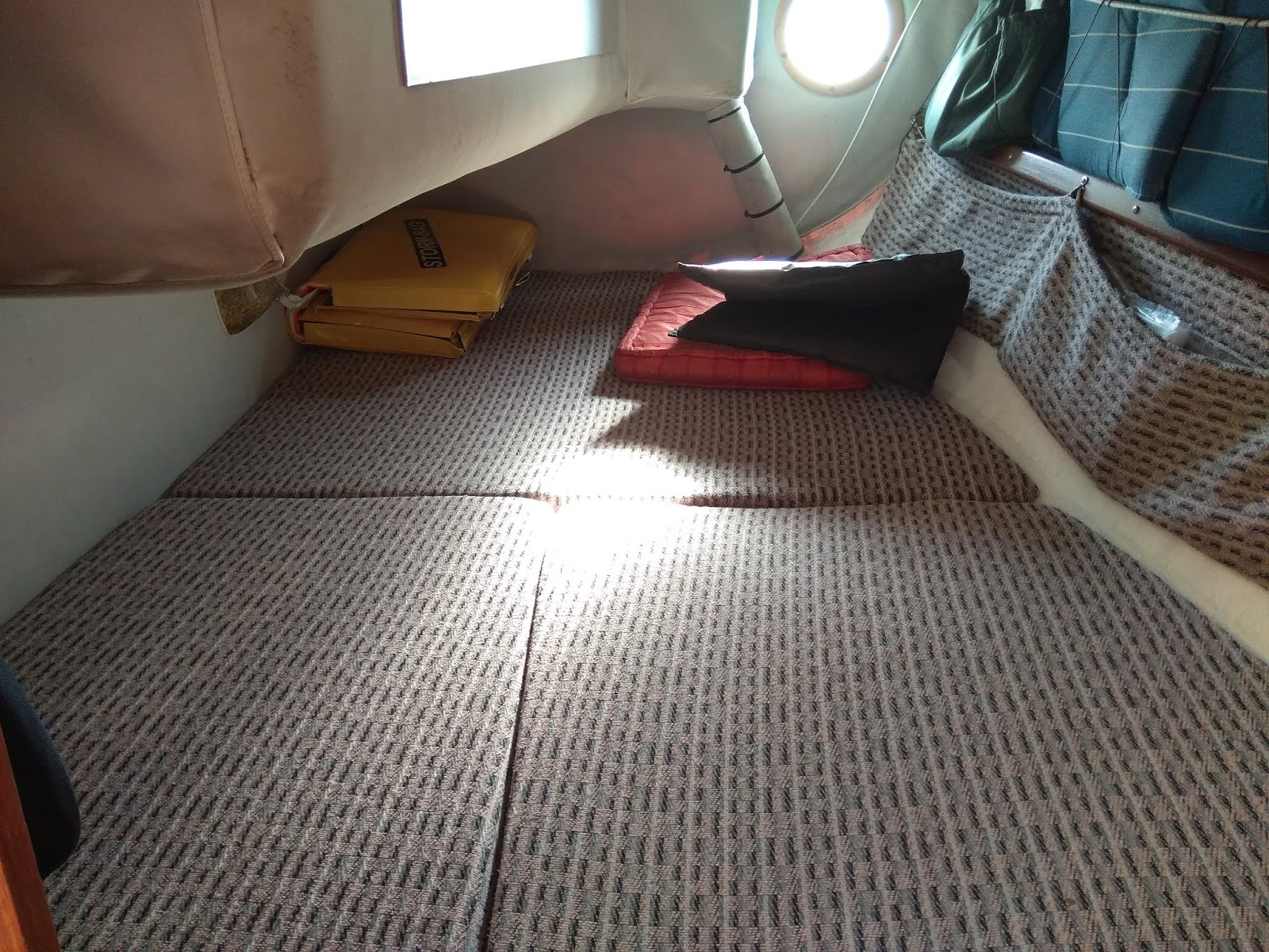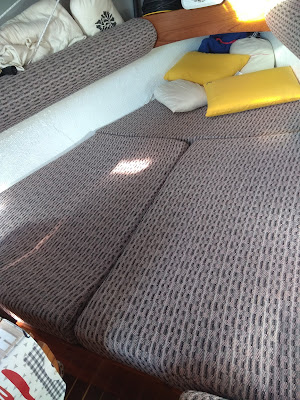 Hoy nos han traído la colchoneta que habían cortado al revés, y por fin ya cuadra todo el tema "colchonetas". Por lo menos en la vuelta a Italia el descanso lo tenemos garantizado, al menos en lo que dependa de la comodidad de los colchones. En los de más uso, además, hemos puesto una capa de unos centímetros de viscoelástico. El de la primera foto es el que estaba cortado al revés. Los siguientes los de popa y los de proa.