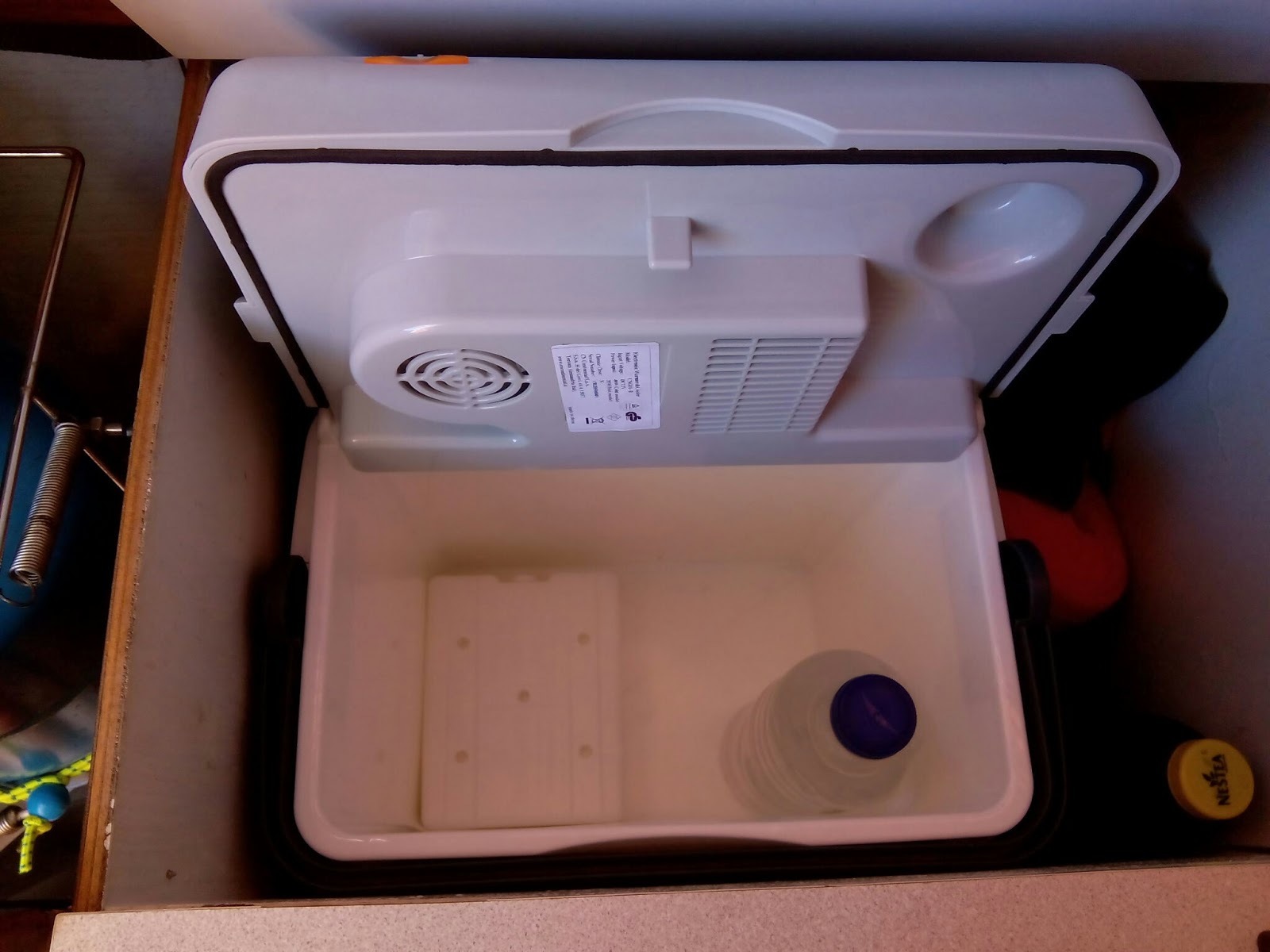 Para la navegación a Bretaña de 2015 instalamos una neverita eléctrica de camping. Utiliza el efecto Peltier, que consigue 18 ºC por debajo de la temperatura ambiente y carece de termostato. No es como las neveras con compresor que alcanzan 4-8 ºC en cualquier circunstancia. Con las del efecto Peltier si en la cabina hace, por ejemplo, 40 ºC (algo habitual en verano cuando dejas el barco cerrado y al sol) dentro de la neverita sólo se consigue bajar a 22 ºC, pero es mejor que nada. Se conecta a la batería y no usa gas, y nuestro modelo consumía 28 W (2 A/hora). Por eso nuestra idea era enchufarla sólo cuando hubiera mucha insolación y el panel solar estuviera cargando a tope, cuando fuéramos a motor (que también carga la batería) o cuando estuviéramos en una marina conectados a la electricidad del pantalán. Además llevábamos dentro algunos frigolines, de manera que aunque no llegasen a congelarse, sí mantenían el frío dentro de la nevera hasta la siguiente escala.