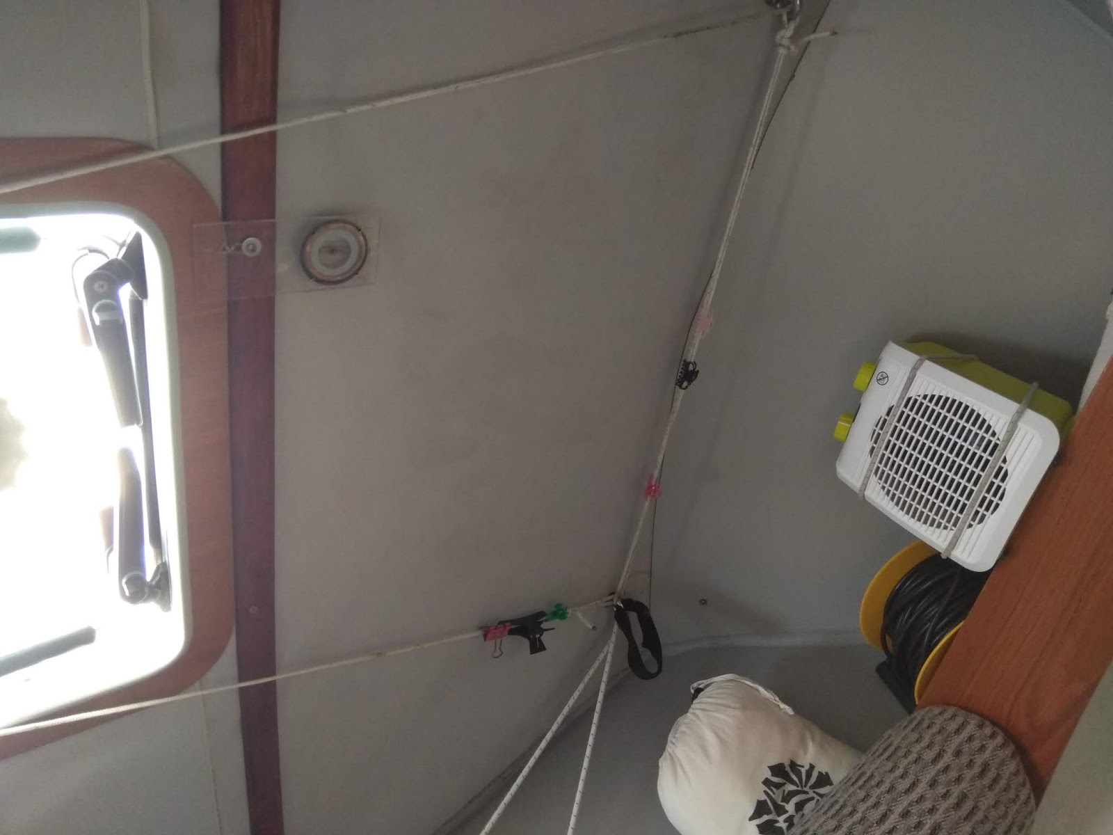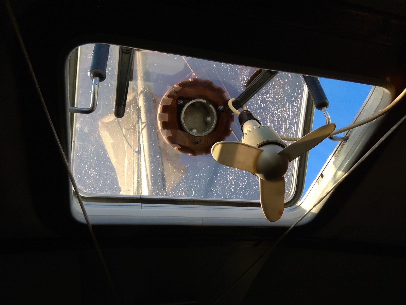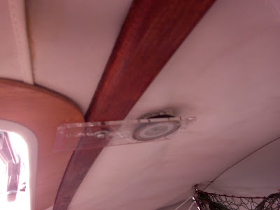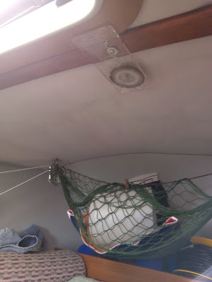 Aprovecho para enseñaros el invento de la brújula de techo. Es una de esas de montaña con el fondo transparente, que te permite ver la aguja desde abajo. La tengo atornillada en el techo de la camareta justo encima de la cama que yo uso. Tiene que ver con el descanso porque me evita tener que levantarme de la cama por la noche o en la siesta para ver si el barco ha garreado o se ha salido de rumbo. Al acostarme oriento la alidada con la aguja de la brújula, y siempre que entre sueños abro los ojos (que en el barco es muy a menudo) sin salir del saco compruebo que sigue en la misma orientación. Si es así, vuelvo a dormirme y me he ahorrado salir del saco a mirar afuera. Y si se ha desviado es una de dos cosas. Navegando, que el barco ha cambiado de rumbo. Fondeados, que el barco ha garreado (al garrear el ancla el barco se atraviesa al viento y la aguja se desvía unos 90 º) o que se ha invertido la marea o ha rolado el viento. En cualquiera de esos casos el velero se ha orientado hacia otro eje de la rosa de los vientos y la brújula lo detecta, y no me queda otra que levantarme a ver la situación.
