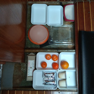 Como la sentina no es un espacio muy limpio sólo colocaremos alimentos envasados, o envueltos en tesafilm, o dentro de las fiambreras. Durante la vuelta a Italia haremos algún comentario cuando comprobemos in situ si esta teoría es cierta o no.