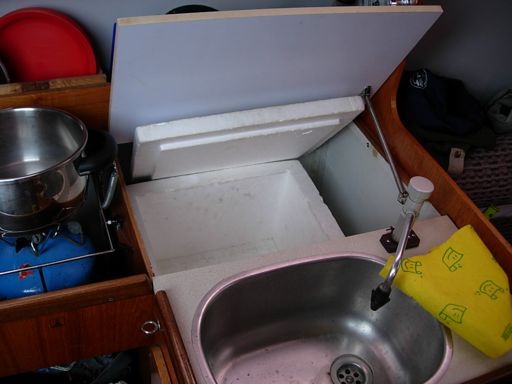 1) La sentina como fresquera. La sentina sólo está separada del mar por unos milímetros de fibra, por lo que la temperatura es su interior es similar a la del agua del mar. Hemos comprobado en Santander, en el mes de febrero, que la sentina del Corto Maltés se mantiene en torno a 11-15 ºC, sólo un grado por encima de la temperatura del mar, y prácticamente no oscila entre el día y la noche, mientras que la camareta llega a 21ºC. Si el patrón se reproduce en verano, cuando naveguemos por el Mediterráneo, significaría 21 ºC en la sentina (estando el mar a 20 ºC) y 40 ºC en la camareta los días de sol. Es decir, 19 ºC de diferencia, prácticamente la misma que con la nevera de efecto Peltier. Por eso estamos acondicionando la sentina con fiambreras y compartimentos para colocar allí los alimentos más sensibles al calor: