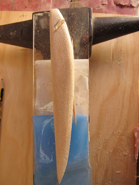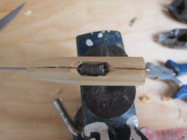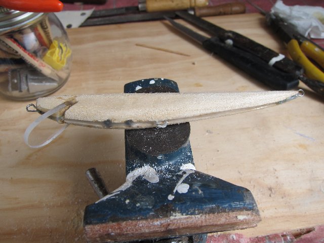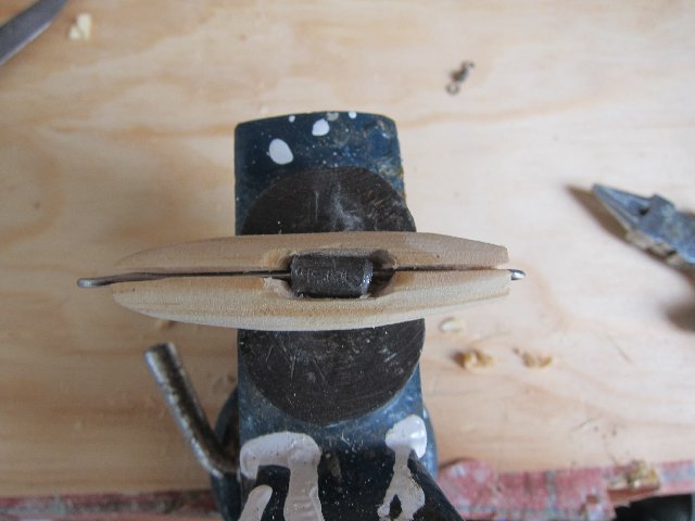 Os paso una fotos de algunos que están la primera fase. Estan hechos en los restos que me sobran de madera de tilo que uso para tallar. Como veras llevan dos huecos en la panza para meter los lastres. Estos huecos están hechos con taladro pero hay que agrandarlos un poco con la dremel o con una gubia media caña a la medida. Tienen que quedar como la plantilla de plástico que ves en la foto. El alambre que uso es de 0'8 que se usa en soldadura autógena. Es muy tenaz y también sirve para hacer muelles. Con esa intención lo compré. También los hay de acero 304 mucho mas docil de trabajar y bastante resistente en un mm. Esto es el alma del señuelo y que soporta toda la fuerza, por eso hay que hacerlo de una pieza de proa a popa y se introduce en el señuelo por un canal previamente hecho con una sierra pequeña o con un disco de dremel. La madera y lo demás es el maquillaje, el músculo es el alambre. Se acoplan los lastres en forma de "U" invertida y se pega todo el conjunto con un buen pegamento. Araldite dos componentes es muy bueno pero caro. Unas gotas de loctite y bicarbonato queda tambien muy fuerte. Los lastres son los que dan movimiento al señuelo cuando le das tironcitos y viene haciendo "Z's" Si quedan imperfecciones se le da masilla corriente de madera.