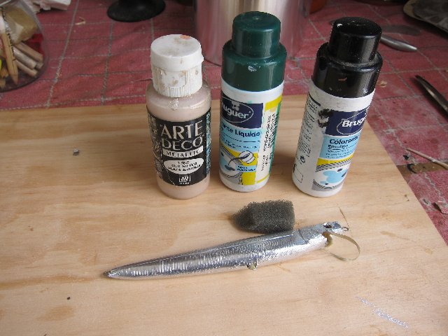 Tengo la madera, Araldit, cianocrilato, algún esmalte de colores , Laca y algo de plomo para llastrar los peces.