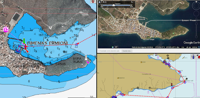 Visitas totales al blog.- Este es el copy pega .......pues eso Agosto de 2019 .- El final del verano Cuando llega el mes de agosto empiezan las situaciones que no nos resultan idóneas para navegar, En el Egeo y el Sarónico ateniense, sopla fuerte el Meltemi. Los barcos de charter lo inundan todo de ruido y falta total de respeto a las normas de la navegación, con lo que los desplazamientos son estresantes. Sin embargo, la temperatura del agua es idónea para el baño y nosotros hemos encontrado nuestra rutina. Hemos escogido la zona del rincón del peloponeso desde la península Argólica a Nomenbasia. Vamos de puerto a puerto, En muchos de ellos tenemos la playa al lado (A veces las playas son minúsculas). Este año ha sido genial el uso del aire acondicionado y... así todo hemos hecho un buen montón de millas. Como los sitios que recorremos ya os los he descrito con anterioridad, voy a hacer un simple repaso a nuestras singladuras por terminar de contaros nuestra travesía, hasta el momento de sacar el barco a su lugar de descanso en nuestro baradero de Kilada, 2019-07-31 De Almiropotamos a Lavrio...... 35.6 Millas ![]() ¿ Por que Lavrio?.- Cada vez que entro en este puerto me hago la misma pregunta. Es un sitio desagradable y el personal de tierra aún mas desagradable. Los muelles están tomados por las empresas de charter y hacen lo posible por que no te metas en sus atraques aunque van a quedar vacios por varios dias. Las posibilidades de conexión son inexistentes y además en las cercanías hay varios fondeos magníficos. Y sin embargo volvemos a entrar y con toda la cara nos metemos en el primer atraque libre que encontramos ( es lo legal, pues son muelles de tránsito) Lavrio con el paso de los años se ha vuelto cada vez peor, incluso este año hemos notado algo que hasta ahora era ajeno a los puertos de Grecia. De noche el ambiente que se mueve en la explanada del aparcamiento es, digamos un poco "chungo" La única ventaja es que es gratuito y está a mitad de camino de casi cualquier travesía que te propongas por esta zona del sur del Atica 2019-08-01 De Lavrio a Poros....................... 34.,3 millas ![]() ¿ Por que Poros?.- Pues porque Poros puede que sea uno de los puertos mas seguros de Esta zona de Grecia. Nosotros siempre atracamos en la zona llamada del Malibú, aunque ahora está siendo invadida por los charter que llevan la comida programada en el Oasis, uno de los restaurantes con mas tiro de todo Poros, aunque nuestro preferido sea el "KARAVOLOS" una pequeña taberna donde la especialidad son los caracoles que hacen con una salsa medio agridulce, como no he comido en ningún otro sitio. Es como llegar a casa. Ahí soy "el Capi" y enseguida llegan a saludar el muchacho del camión del gasoleo, el camarero del restaurante, que nos ayuda con las amarras, la chica encargada del cobro de los atraques ( 10 euros) y que siempre nos hace algún descuento. Muy cerca hay una diminuta tienda de efectos navales, donde Spiros a golpe de teléfono te suministra cualquier cosa y que es donde hago el 90 % de las compras náuticas en Grecia Y el paseo al caer la noche hasta la zona de atraque masivo de los charter a tomar un fabuloso helado en Pagotomanía, con sus 46 variedades de helados. Y a veces por pura diversión nos vamos a hacer la compre a Gálatas en unas pequeñas barquitas que hacen la linea de cruzar hasta la costa enfrente. Los sitios posibles para fondear en las inmediaciones son infinitos, no recuerdo todos en los que hemos estado, aunque siempre repetimos el de Rusian Bay, con su pequeña isla 2019-08-04 De Poros a Ermione.....................21,3 millas ![]() ¿ Por que Ermione?.- Si Poros es como nuestra casa, Ermione es es nuestra casa. Fondeamos y estamos atentos a que se quede libre alguna plaza en el puerto pesquero (ocho o diez atraques) y ahí nos quedamos dias y dias. La punta que cierra la bahía es un bosque de pinos con un sendero que recorre su perímetro hasta llegar al puerto nuevo al sur, del que se puede volver caminando unos pocos metros. Una pequeña playa es la preferida de Drako para darse sus baños . Los jueves hay un mercadillo de frutas y verduras, aunque hay un fenomenal supermercado y yna gran ferretería. El Ganosis, es un restaurante regentado por una Española, vasca ella, ha conseguido ser uno de los mas apreciados de Grecia, pero nosotros somos mas de ir a una diminuta taberna que hay en el interior del pueblo a comer unos Giro Pitas a 1,80 la pieza . Solo si hay algún compromiso recalamos en el Ganosis, resarciéndole del uso que hacemos de su WiFi. 2019-08-09 de Ermione a Pto.Koilada......... ..23.5 NMi ![]() ¿ Por que Koilada ?.- Raramente atracamos en el puerto de Koilada. Cada vez que llegamos aquí es para entrar o salir del varadero y solemos atracar directamente en los espigones del Travelif, pero esta vez estamos tratando de resolver un problema de fuga de agua que nos lleva de cabeza y que merece una entrada para el solo. 2019-08-10 De Pto Koilada a Astro........... ....17.7 NMi ![]() ¿ Por que Astro?.- ¿ Hay alguna forma de navegar mas confortable que un través con viento fresco en un mar como un espejo? Cuando empiezan los vientos del norte en la zona de la bahía de Naplio no se levanta una ola importante y además hasta casi las 11 de la mañana no comienza a soplar fuerte, Así que en esta zona es fácil navegar a vela en la dirección este-oeste y viceversa. Y aunque Naplio es una de las ciudades mas bellas de esta zona y con mucho que ver, desde sus tiendas personales , sus callejas llenas de tabernas y su impresionante castillo, tiene el problema de tantos y tantos puertos en Grecia. La falta de conexiones de agua y electricidad. Sin embargo , en la costa del Peloponeso bajando hacia Monenvasia hay Varios sitios donde resguardarse de los vientos y enchufar el aire acondicionado, Y uno de nuestros preferidos es Astro, un pequeño puerto con una buena cantidad de atraques enfrentado a un pueblo tur