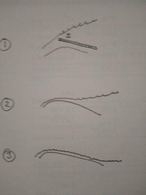 (1) Tabla, Sustentación de muy baja calidad, debido a que la separación (s) del flujo ocurre en el borde de ataque y desvía el viento con la cara de barlovento. Esta Sustentación es de tan baja calidad que no sirve para ceñir con un velero, pero tal vez podría servir para un Caricoche con ruedas o con cuchillas sobre el hielo