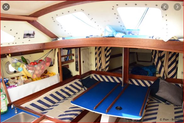 Pese a su pequeño tamaño, el Baluchon está muy bien aprovechado en sus espacios interiores, la cabina cerrada llega hasta la misma regala (el mismo borde del casco) y hasta el espejo de popa, y Yann se ha acostumbrado a estar cómodo en su pequeño mundo. Viendo estas fotos del interior compruebo que es casi tan grande como el Corto Maltés, que tiene seis metros y pico.