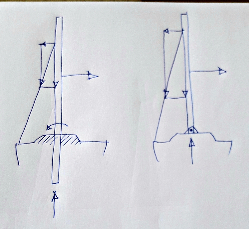 pero además,con independencia de que el palo pasante tenga más resistencia que el apoyado en cubierta,influye positivamente el hecho de que las burdas reparten los esfuerzos creando un triangulo entre jarcia - palo y casco disminuyendo la flexión (y pandeo) del palo.
