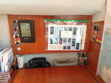 Los barómetros analógicos tienen también una aguja loca que mueves tú con la mano (en la primera foto, la dorada) en teoría para dejarla sobre la otra marcando la lectura anterior, pero con los pantocazos del barco esa aguja no se mantiene en su sitio, y no te sirve.