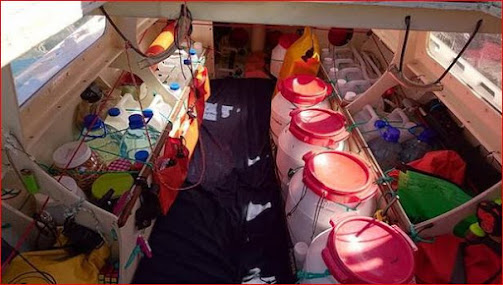Hola navegantes. Ya os hablé de este marino francés seco como un asceta, Yann Quenet, que está dando la vuelta al mundo en un velero de 4 metros de eslora. Actualmente está en Nueva Caledonia preparándose para la etapa más larga: 7.000 millas sin parar hasta la isla de Reunión, ya que con el Covid no puede detenerse en Australia. Como no puede meter en el barco toda la comida y agua que necesita, obligatoriamente dependerá de la pesca y de la lluvia para subsistir. Ha embarcado víveres y agua para 60 días de autonomía, cuando piensa tardar entre 70 y 80 en el mejor de los casos. O sea, justo lo contrario de lo que se recomienda, que es cargar víveres para una vez y media el tiempo previsto de travesía, por si algo se tuerce. Las primeras etapas serán por el Estrecho de Torres, al Norte de Australia, sembrado de islas y arrecifes y barrido por poderosas corrientes. Si allí se queda sin viento, o con brisas flojas, y debido a lo cargado que va el barco, seguro que no avanzaría, así que tiene previsto tirar parte del agua si eso ocurre, unos 20 o 30 litros. Luego dependería de la lluvia. Como dice Yann, es un círculo vicioso: cuanto más cargas el barco más despacio vas; cuanto más despacio vas, tardas más tiempo; y cuanto más tiempo tardas, más comida y agua necesitas. Para recoger la lluvia ha ideado un toldo, sobre la popa, que la canaliza a un cubo. Respecto a la comida, ha embarcado sobre todo liofilizados y conservas. En la siguiente foto podéis ver cómo lleva el interior del barco, que sólo le deja un estrecho pasillo entre los bidones para tumbarse a dormir. Y dice Yann que como en Nueva Caledonia le invitaban siempre ha comer ha engordado, y va a estar más apretado de lo previsto. Preguntado de nuevo por la talla de su barco, dice que todos los capitanes tienen el síndrome del “metro de más” (pensar siempre que un barco con un metro más sería el perfecto). Opina que lo hacen para sentirse más seguros en el mar, pero él cree que cuanto más pequeño, menos problemas. Por ejemplo en la siguiente foto podéis ver los manguitos que se ha hecho por si le rompe el mástil en un temporal. ¡Parecen rollos de papel de cocina!. Pues son suficientes para resolver esa avería, que en la mayoría de los barcos se considera el final. Y otro ejemplo, la rotura de los sables de la vela mayor la ha resuelto sustituyéndolos por cable eléctrico gordo. Como materiales “de lujo” ha embarcado un emisor AIS, para que le vean los mercantes en sus pantallas, y dos pilotos automáticos de respeto. Dice Yann que se está aburguesando. Con cuidado, navegantes.