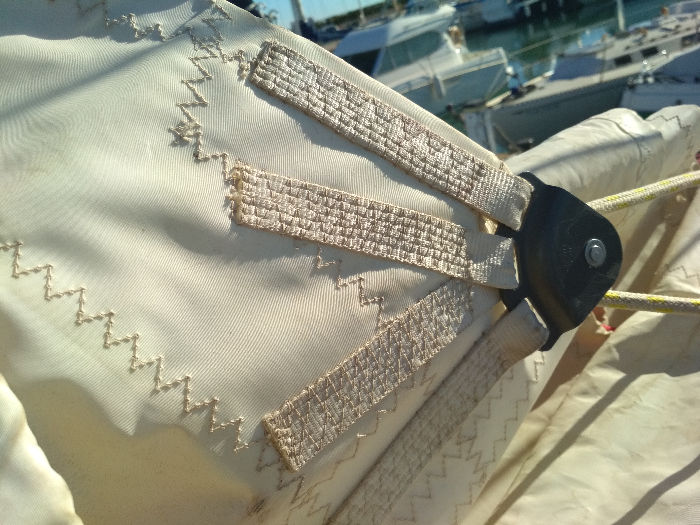 Ya he cambiado todo, menos los dos cabos de los rizos que van del grátil a las poleas del interior de la botavara. Estaría bien poder ver el sistema por dentro.