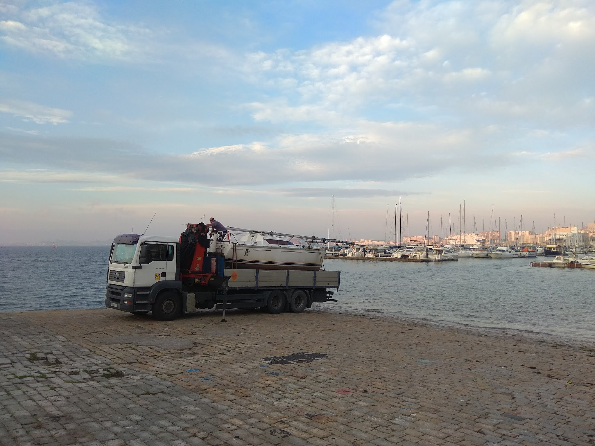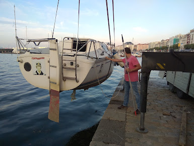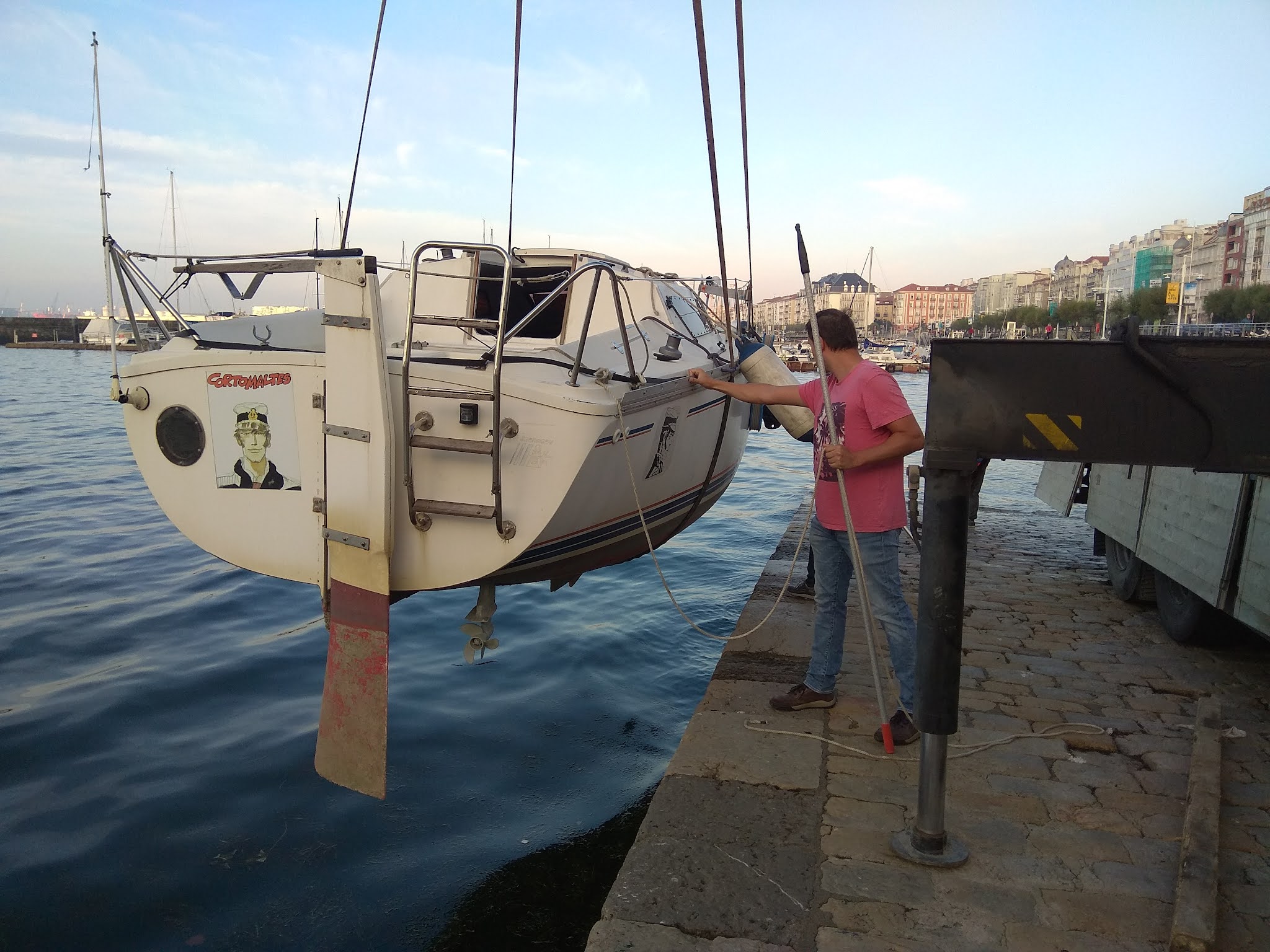 Hola navegantes. Como estaba previsto, esta mañana llegó el Corto Maltés a Santander. Han sido dos días de viaje por carretera, en los que ha deshecho el camino que por mar nos costó casi cuatro meses: Nos ayudaron en la maniobra Tito, Miguel y Nacho. Antes de botarlo aprovechamos para limpiar lo más posible los caracolillos que traía del Mediterráneo. Pero de nuevo ha quedado de manifiesto que no me libro de sacarlo el año que viene para renovare la patente, porque realmente estaba muy, muy sucio. También aproveché para inspeccionar el mástil mientras estaba en tierra, y por suerte allí no había problemas. Después botamos el barco sin el mástil. Esa es la parte fácil. Sólo teníamos que estar pendientes de ir aflojando las amarras, porque la marea estaba bajando, hoy concretamente casi 3 metros. De vuelta al Cantábrico tengo que recuperar los reflejos respecto a la marea, que después de 4 meses en el Mediterráneo temo haber perdido. Luego viene lo difícil, que es poner el palo. Hay un momento peligrosísimo, que es cuando ya has puesto el pasador que lo une a la cubierta, pero sigue sujeto arriba por la grúa. Si en ese momento pasa un barco haciendo olas, en el seno de la ola el barco desciende, y como la grúa está sujetándolo por arriba podría arrancar el soporte de la cubierta. Por eso hacen falta muchas manos para enganchar rápidamente la jarcia, al menos cuatro personas: una para cada obenque, una para el el estay y otra para el backestay. Cuanto antes pueda soltarse de la grúa mejor. Luego, sin prisa, se afianzan los otros dos obenques y se ajusta todo para que el palo quede recto. Por suerte todo salió bien, y luego Ana y yo hemos dedicado casi todo el día a ajustar la jarcia, poner las velas, la electricidad del palo, y ordenarlo todo, pero ya tranquilamente en nuestro atraque. La lista de trabajos pendientes de de 14, o sea que necesitaremos varios días para dejar al Corto Maltés en plena forma. En los próximos días haré un balance de esta navegación de la vuelta a Italia. Con cuidado, navegantes.