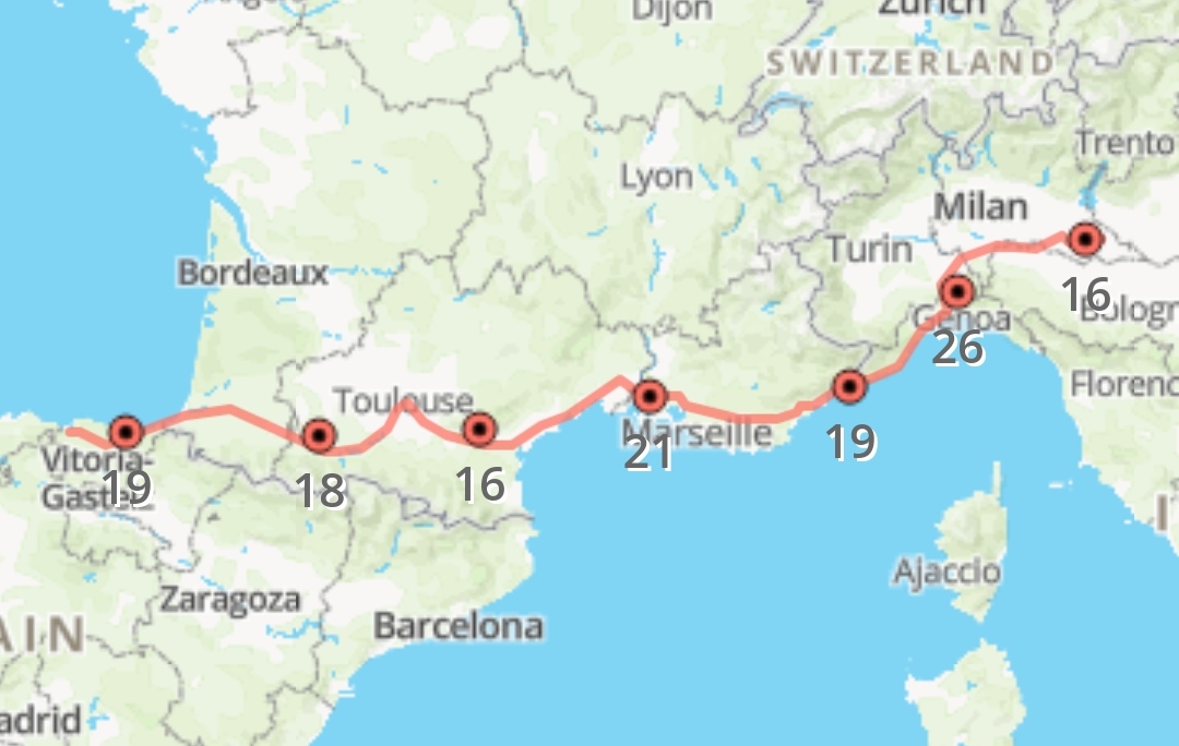 Esta es la dibucarta de cuando llegamos a Italia después de hacernos toda la costa mediterránea de Francia, y nos acordábamos de las dificultades legales y administrativas relacionadas con el Covid antes de salir de España. Hacer clic encima para verla mejor. Como siempre, regalo el dibujo original al primero que la traduzca.