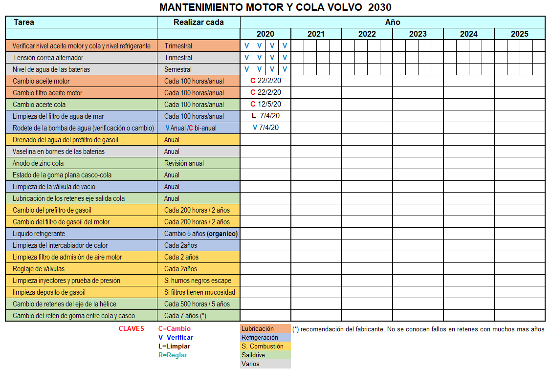 Para organizar los mantenimientos y dejarlos registrados, utilizo una hoja excell que me sirve para saber cuando se hizo cada mantenimiento y cuando tocará el próximo.