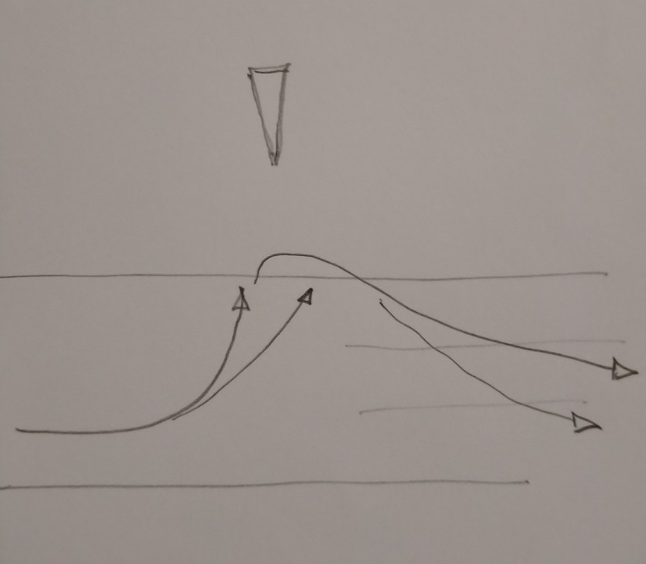 ![]() Resumiendo la cuestión de las Proas Escoradas navegando delante de grandes Olas a) rota la simetría ... el medio Angulo, el "semi Angulo" (A) de la proa vista desde arriba es el Angulo de Ataque que ve el agua en sentido Lateral b) la inclinación lateral de la proa vista desde proa: el agua por así decirlo agarra y ejerce más fuerza Lateral sobre la proa más vertical c) dónde está el borde de ataque y qué forma tiene d) con un gran Angulo (ya de la Proa ya de la suma de Proa más guiñada/ Abatimiento) es tontería pensar que el borde de ataque está en la Roda pues el fluido tiene una gran componente que atraviesa ("cruce del fluido" o "flujo cruzado") que provoca desprendimiento del flujo (d) torbellinos (t) y succión (s) e) y a fin de cuentas si la Proa se hunde crea un montón de Arrastre (D, Drag) que haciendo pareja con la Ola empujando pa rriba y pa lante en el límite crea la cabezada (Pitch) con salto de pértiga (Pole) y cabriola popa sobre proa Total La cosa del Catamarán en caso extremo de Fuerza 10 es frenarlo . Editado por U25pies en 06-07-2023 a las 20:04. |