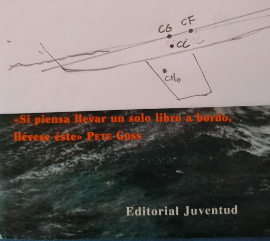 ![]() Quizás "Quizás uno de los aspectos más significativos del temporal fue la sorprendente cantidad de problemas que encontraron los veleros que corrían el temporal.(...) Seis veleros sufrieron un vuelco de 360 grados" (Peter Bruce, Navegación con mal tiempo, páginas 264 y 265) Claro Centro hidroDinámico de la Orza (CHo) a proa de un Centro de Gravedad (CG) que a su vez va a proa del Centro de la Flotación (CF) y encima para rematar la faena nadie se ha preocupado de hacer una Estimación razonable del Momento de Giro del Casco del Monocasco Menos mal que hasta Fuerza 10-12 esto no es problemático |