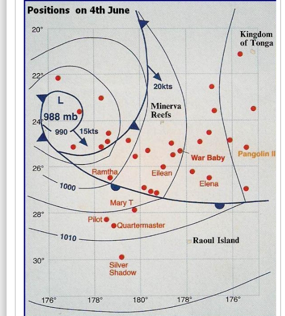 ![]() Así resulta que ... Los que estaban en el así llamado 'sector bueno' lo pasaron fatal: 6 de ellos volcaron dando una vuelta de campana, y Y los que estaban en el así llamado 'sector malo' pues no lo pasaron tan mal Claro, se le llama 'sector bueno' por la idea de que puedes huir ... corriendo el temporal y, en cambio, los que están en el lado llamado 'malo' lo tienen que capear Uno simplemente puso máquina avante y con el tremendo temporal pues mantenía la posición proa a las Olas |