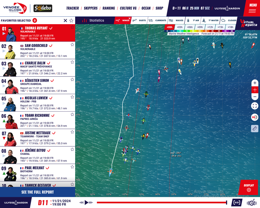 Una de las razones, bien entendibles de esa decisión, era que la calma que pasó la flota por el W ayer fuera realmente más importante de lo que estaba prevista. No lo ha sido, el viento no ha parado por completo y ahora Goodchild empieza a acelerar y con él toda la flota detrás. Yo creo que aquí quien ha triunfado es ECMWF, el modelo meteo europeo, GFS daba hasta hace poco más calmas. Le Cam iba de 17 hace cinco días y no parece que vaya a mejorar esa posición al llegar a la convergencia intertropical, que parece que tiene calmas más acusadas al E. Es interesante que se visualicen diferentes rutas? Si, pero las posibilidades de éxito de ir a la contra de lo que dicen las predicciones son pequeñas. Eso hace este deporte más aburrido, obstruye la genialidad? Yo creo que no, las herramientas cambian, pero hay que saber utilizarlas. Y el nivel de la flota ne parece altísimo, solamente estar ahí ya demuestra genialidad! ![]() Enviado dende o meu SM-G736B usando Tapatalk