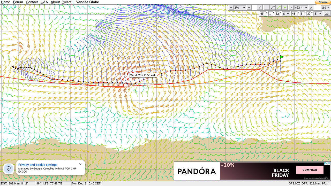 El equipo de Dalin ha publicado un comunicado en el que el navegante asegura no estar seguro de l a decisión tomad aque los partes han empeorado y que encima se retraso mucho ayer en la zona de transición. La verdad que viendo lo que ponen los partes parece muy difícil navegar en esas condiciones. Las de la parte trasera de la baja que es algo en el papel demasiado grande para ser aceptable. El jueves tarde noche será lo máximo. Simon se ve igual.