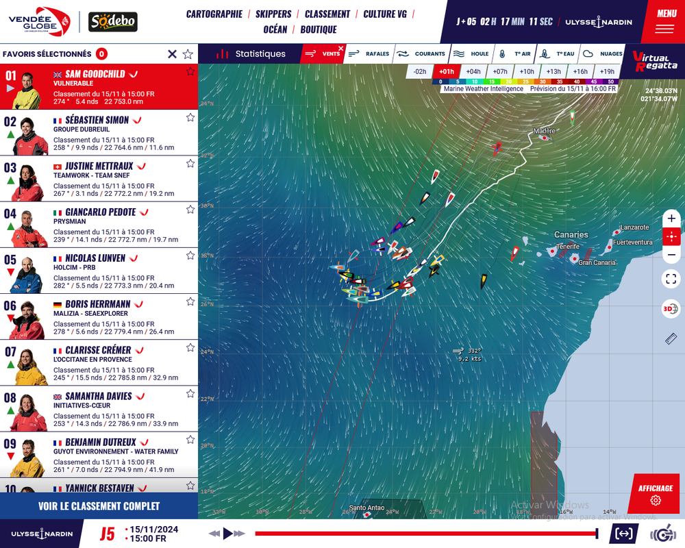Seguramente será breve el que Le Cam aparezca en primera posición...pero es agradable ver a un "veterano" que no cumple, para nada, con el arquetipo de navegante "pro" con cuerpo de atleta, rebosante de juventud y arropado por grandes presupuestos...como líder de la Vendee globe en 2024 con un barco sin foils...
