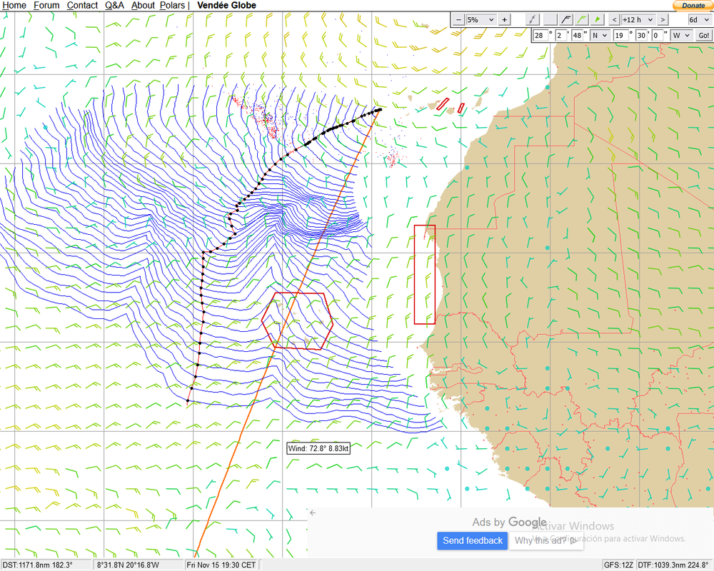 -por el W la cabeza de regata hasta el parón y se han unido Pip Hare, Dutreux y Louis Duc -por el E Le Cam y Colman -entre ambos Simon, Cremer, Pedote, Davies, Ferré (hasta aquí el primero sin foils), Cornic y Roura El primer grupo va entrando en viento, con medias de entre 40 y 60 millas cada 4 horas; en el E van a 27 y 28 millas cada 4 horas y el grupo central van entre 35 y 47 millas pero con un rumbo más cercano al de la ortodrómica. Las predicciones son difíciles, parece que van a tener más viento en el W, pero después se pararán, y en el E no están tan lejos de un alisio muy típico a partir de Cabo Blanco, para pasar al sur del archipielago de Cabo Verde.. ![]() A ver que sucede.. ![]()