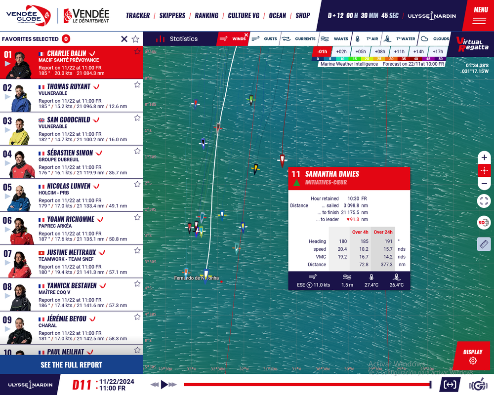 Este viernes 22 de noviembre en un mensaje de audio detalla su último revés. “Recibí un golpe muy fuerte en la rodilla, no es demasiado bueno. Se hinchó bastante. Intento no moverme demasiado. Intenté hacer una maniobra lo mejor que pude... veré cómo evoluciona. Este asunto me preocupa un poco. Le pongo frío”. Recibió un duro golpe en la rodilla el jueves 21 de noviembre. Charlie Dalin amplía la brecha con sus perseguidores El patrón está ahora por delante de Thomas Ruyant (Vulnerable) y Sam Goodchild (Vulnerable) con una diferencia cada vez mayor: en el check-in de las 11:00 horas, tenía 12,60 millas con Ruyant y 15,96 millas con Goodchild. ![]() |