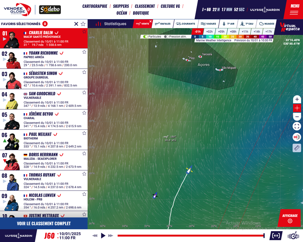 Según los itinerarios para los próximos días, Dalin debería encontrarse con una zona de viento débil a medida que se acerca al archipiélago de las Azores, lo que permitiría a Richomme volver a su nivel a menos de una semana de la meta.