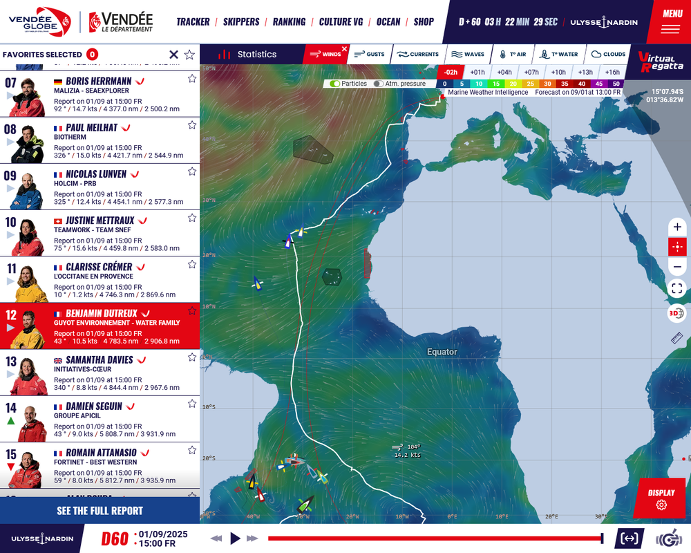 Dalin ya ya pasado la latitud de Canarias, 177 millas por delante de Richomme y algo más orzado. Zezo, con las polares que tiene, que ya hemos visto que son cortas (los de la regata virtual acaban de pasar Cabo Frío usándolas), le dan la llegada el 15 a mediodía, pero recomienda alguna trasluchada corta para meterse más en el viento de la borrasca.