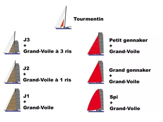 ![]() Normalmente o mejor dicho antiguamente porque no se para de evolucionar, se llevaba este guardarropa Una mayor Un tormentín de al menos 20m2 Un J3, vela de ceñida dura o trinqueta de asimétrico Un J2, vela de ceñida y través cerrado a partir de 12 nudos Un FRO, vela de ceñida con brisa ligera y través en todo el rango hasta portante Un J0, gennaker a tope de palo de 190 m2 para brisa ligera y través Un A7, fraccional para través y gennaker de viento duro Un A3, gennaker de alrededor de 300m2 para portantes hasta 25 nudos |