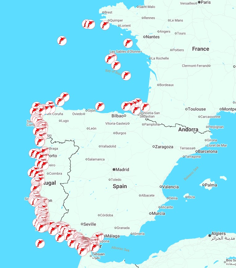 Otra caricia enfrente a Camarinhas hoy, poco despues de un aviso de avistamiento enfrente a Muxia. Se entiende que es un grupo subiendo (probablemente el mismo que de las Cies.