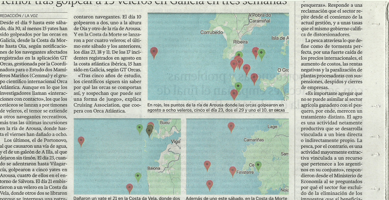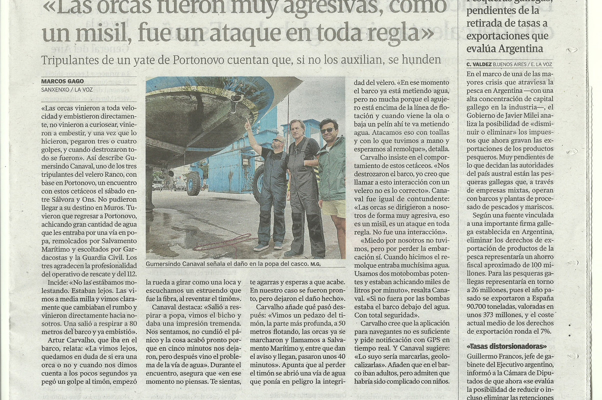 «De repente notei un estalo e perdera o temón. Cando paramos o barco e miramos para o mar vimos que estaba cheo de orcas. Puxemos punto morto e cando nos quixemos dar conta debía de haber unha ducia delas por alí. Habíaas grandes e pequenas», cuenta el patrón.