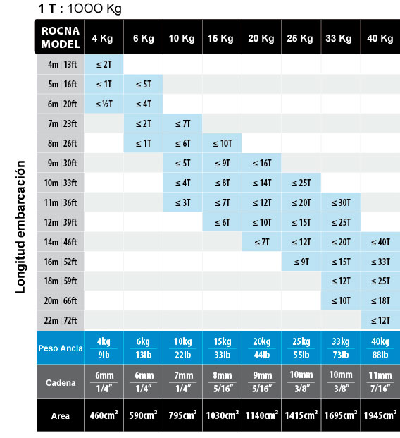 peso >1 y <6 toneladas (3ª columna), el ancla que indica Rocna es la de 10Kg.