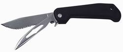Tiene una hoja con dos filos uno de ellos dentado, la potencia que da su tamaño se agradece cuando por ejemplo tienes que cortar un cabo enrrollado en la helice, con una navaja es tarea imposible