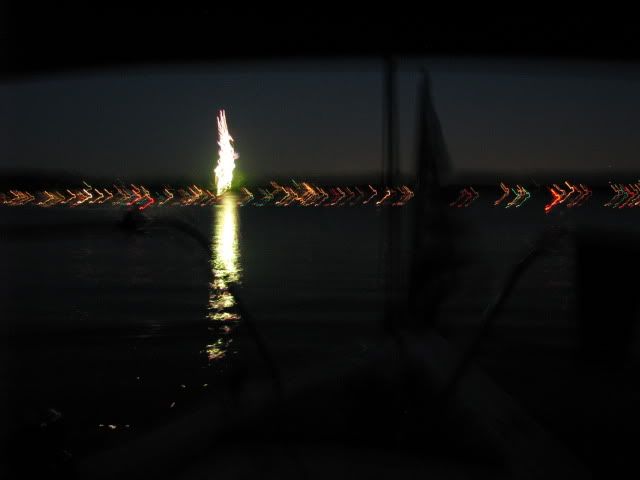 Los fuegos artificiales, las luceitas en el horizonte son las luces de navegacion de algunos de los barcos mirando los fuegos: