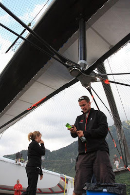 Esa estructura en Y es una celosía espacial. Ese puntal que aparece en la foto está justo debajo de la unión de los tres brazos de la Y. Los tirantes que parten de la base conectan con los extremos de cada brazo, de esta forma ayudan al aka de proa a sostener el palo, dándole mas rigidez. Ya hay fotos de como se están haciendo las velas de alinghi, así que en principio nada de velas rígidas.