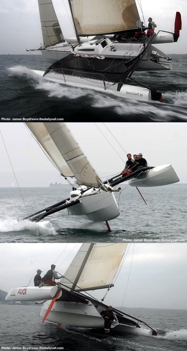 Tengo un pequeño cata de 8 mts. con orzas laterales,con el que navego por el Cantábrico.Disfruto como un enano de las "sensaciones" de navegar en multicasco,diferentes a las de un monocasco,en los que he navegado toda mi vida,ni mejores ni peores..ciñe casi como un monocasco,aunque la mar de proa no sea lo suyo..eso si, siempre hay que estar atento a una posible racha..y soltar carril de escota a la minima..También hay que rizar antes y más que en monocascos..