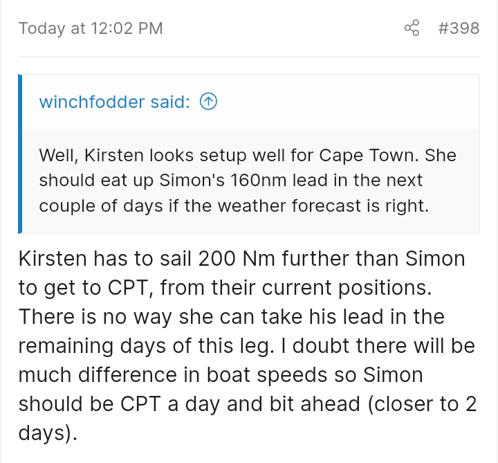 Muchas gracias a todos por vuestra aclaraciones,; a mi me cuesta mucho digerir el porque de las deciosones que toman; me limito a mirar las millas que corren cada 24 horas y el inglés, suele ser el mas rápido; viendo las previsiones para los próximos días Tapio y Simon tendrán viento de través y la fémina de empoppada; yo creo que la duda esta sean si recupera o no la segunda posición; la primera parece difícil. Como habéis indicado queda mucha tela que cortar.