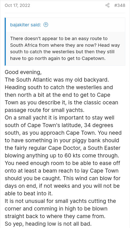 Estoy convencido que en su cabeza ya está maquinando como salir de la "trampa" de Cape Town, como superar la zona donde más castiga la corriente de las agujas y como adentrarse en el Indico de la mejor manera posible...