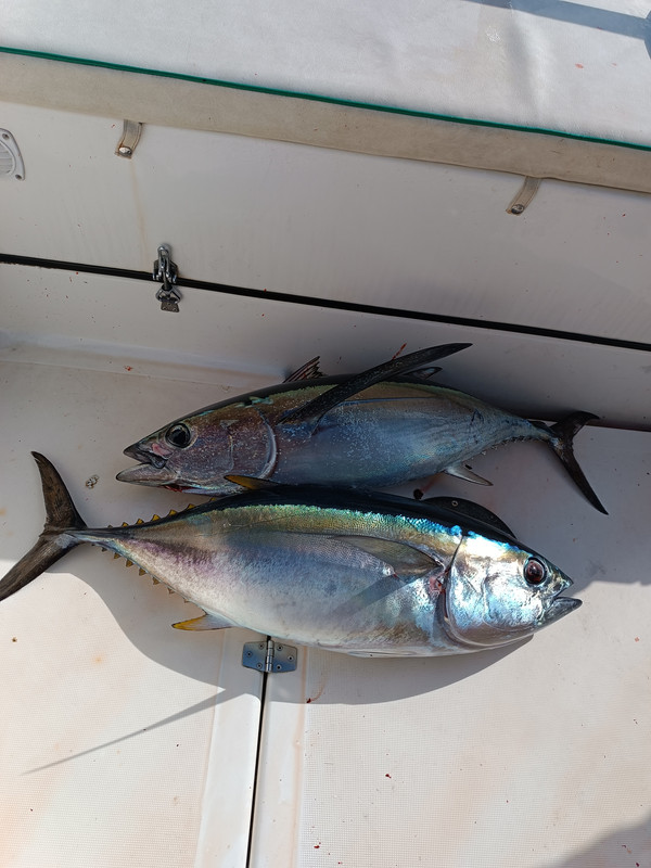 Muy buenas Martín, ayer hablamos por la emisora era yo el que llamó a tu tocayo y al igual que el año pasado respondidas tu . Respecto a la pesca sin queja, buenos peces entre el 37-40 arriba y 27-22 abajo, da gusto ver doblar las cañas con estos buenos aparatos, entre los alalungas se coló una obesus de 12kg, una pena no haber trabado más que abundaban, se tiró a una caña de 20 brazas a la maluta , verde por supuesto, a mí me gusta más tanto para embotar como para rodajas
