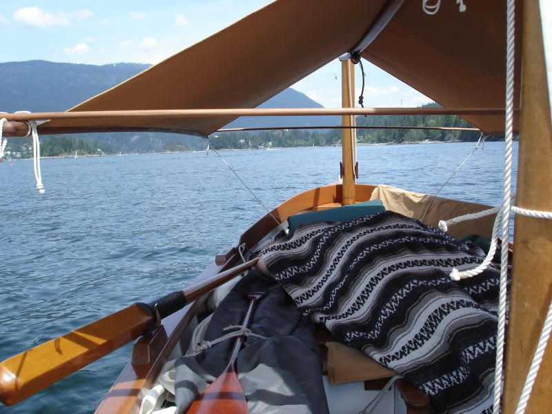 "Sea trials yesterday. We rowed and sailed with the mizzen set and the awning up for most of the day. What an amazing difference under the awning. It actually feels like a cool breeze is blowing. It doesn't seem to affect the sailing either (although with just the mizzen set aft I don't expect much) we usually row/sail in light air anyway just to keep moving. Heaving to worked well, with the only difference being the boat fore-reaching rather than the usual head up and fall off behaviour. The setup didn't seem to interfere with the mizzen snotter and the mizzen can still be released past 90 degrees to spill the wind, though I'd strike the awning long before the wind picked up.