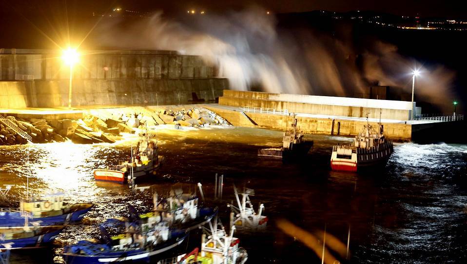 Y por la noche en Malpica se metió duro. Aquí tenéis una foto del mar saltando por encima del dique. Los que lo conozcan se darán cuenta de la altura de las olas: