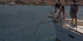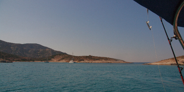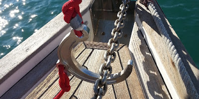 ![]() En ese mismo puerto y en otro, cuando hemos enganchado un ancla contraria, lo hemos hecho simplemente con un cabo y bichero, más simple pero igual de eficaz. En Grecia, el que va a levantar el fondeo en puerto debe llevarse ese cabo o aparejo a proa SIEMPRE, salvo que tengas la total certeza de que nadie ha cruzado su cadena, ni tú cruzas la de otro, información solo privilegiada para los descendientes de Poseidón, sobretodo si el agua está turbia. Se prepara un cabo de longitud suficiente, preferentemente dos veces la profundidad, y de capacidad suficiente para aguantar una cierta fuerza, importante, que no flote mucho y se hunda fácil, las amarras no son buenas, es mejor la típica driza preestirada que se guarda del último cambio de jarcia de labor, vale una ex-escota. Si no hay otro remedio se le puede poner un peso. Al extremo del cabo se le hace una gaza, suficientemente amplia para que quepa en la cornamusa de proa. Al descubrir que tu ancla sube una cadena, se mantiene enganchada lo más alta que se pueda, se tira la gaza que al hundirse se 'pesca' con el bichero por el otro lado de la cadena 'enemiga'. Se sube la gaza a la cornamusa y el otro extremo del cabo se sujeta en esa misma cornamusa, mejor sin anudar. Se baja un poco el ancla propia hasta que libera la otra cadena, ahora colgando de nuestro cabo, y ya subes libre tu ancla y sueltas el extremo del cabo que sujeta la otra cadena, que cae libre. Es fácil y se hace en menos de un minuto (de verdad, así me ha pasado dos veces) siempre que consigas subir la cadena contraria a la altura de bichero (nivel del agua o algo más bajo). Esto se suele dar cuando coges una cadena de un barco normal (hasta 30 m.). Para el caso de que pilles la de una línea de muertos (suelen estar cogidas en dos o más puntos a muertos en el fondo) o la de un barco grande, con la que no pueda tu molinete, sueles necesitar bucear, en algunos de esos casos, es mejor el aparejo de Teach. |