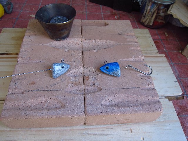 Molde tallados con Dremel en ladrillo refractario. Aguanta el calor tela y no se agrieta. Varilla de acero 316 para hacer el alma donde engancha el anzuelo. Una vez hecha se mete en el molde en sus ranuras y se cuela el plomo hasta el borde. Se le quitan las rebabas se afina y se le da un calentón a la cabeza. Justo en seguida se baña en polvo plástico termo-adhesivo. Se decora con el color que quieras, se ponen los ojos y por último un baño de barniz cristal.
