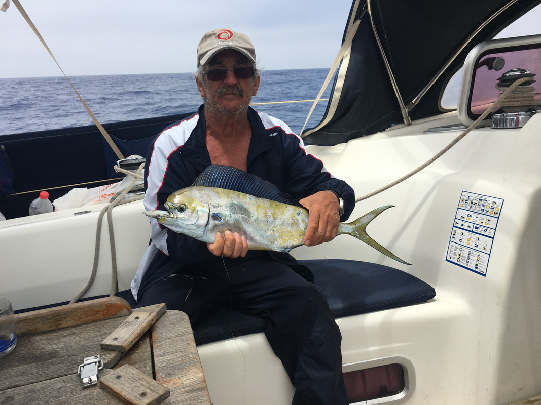 Comimos llampuga a la plancha y ensalada. Lastima que olvidase comprar ajos en Tenerife. A media tarde volvió a sonar una de las cañas. Pedro sacó una llampuga un poco mas pequeña pero interesante. Asió su palo de selfi y se hizo media docena de fotos. Llegué a pensar que la iba a adoptar. Al final terminó en el frigorífico.