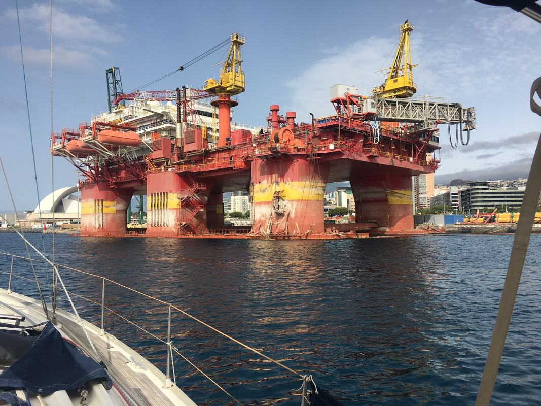 Puse en marcha el motor, y solté las amarras. Hice una virada en redondo por babor y por el canal 11 pedí permiso para atravesar el Puerto de Santa Cruz de Tenerife. El puerto estaba vacío salvo por la plataforma petrolífera. Esa imponente estructura flotante de color naranja debía llevar años allí. Mas allá en tierra, el auditorio. Una de tantas obras de Calatrava, imitación quiero y no puedo de la opera de Sidney.