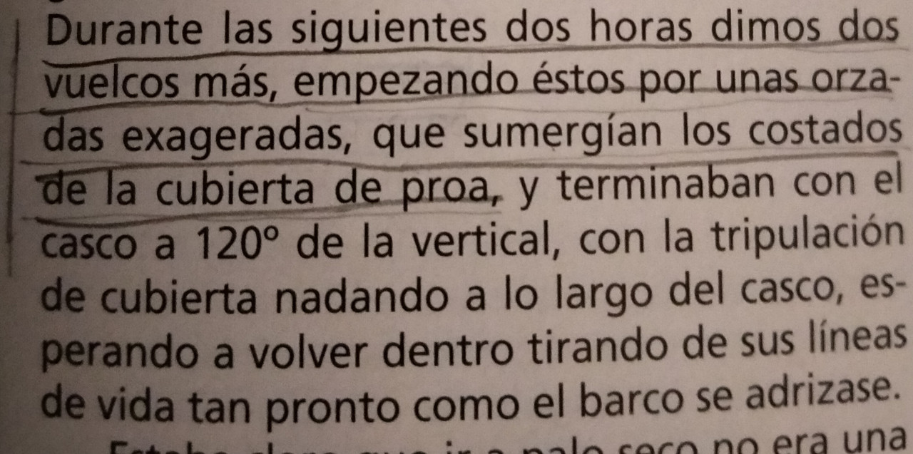 ![]() (De "Navegación con mal tiempo", traducido y publicado por Editorial Juventud): volcaron Tres veces al bajar una Ola Un minuto es tiempo de sobra para volcar Los veleros "Tradicionales", con profundo pie de roda y quilla corrida horizontal volcaban en un vuelco dinámico, hidroDinámico, al bajar la Ola rumbo al centro de la tierra Este tipo de vuelco, el vuelco dinámico, ha plagado la historia de la navegación desde tiempos digamos de los hermanos Pinzón Este tipo de vuelco, el vuelco dinámico, el vuelco hidroDinámico, donde el barquito se tropieza consigo mismo y vuelca lo volvemos a ver en los veleros modernos que nacen y se forjan rumbo a la boya de barlovento en una regata veraniega |