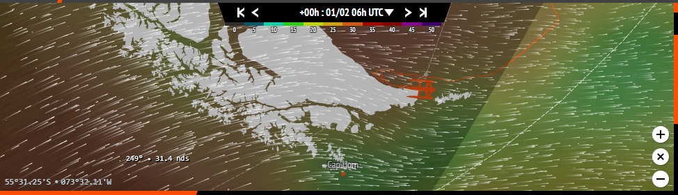 Están dando bordos cerca de tierra buscando socaire. Se pueden aprovechar de su escaso calado para buscar la mayor protección. Mal lugar para estar mucho rato en cubierta con maniobras. Más de 20 nudos de viento y cero o menos grados de temperatura... Y perdiendo ventaja... Como dijo Caribdis, Hornos decide.