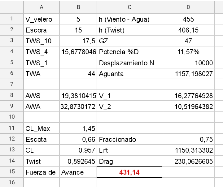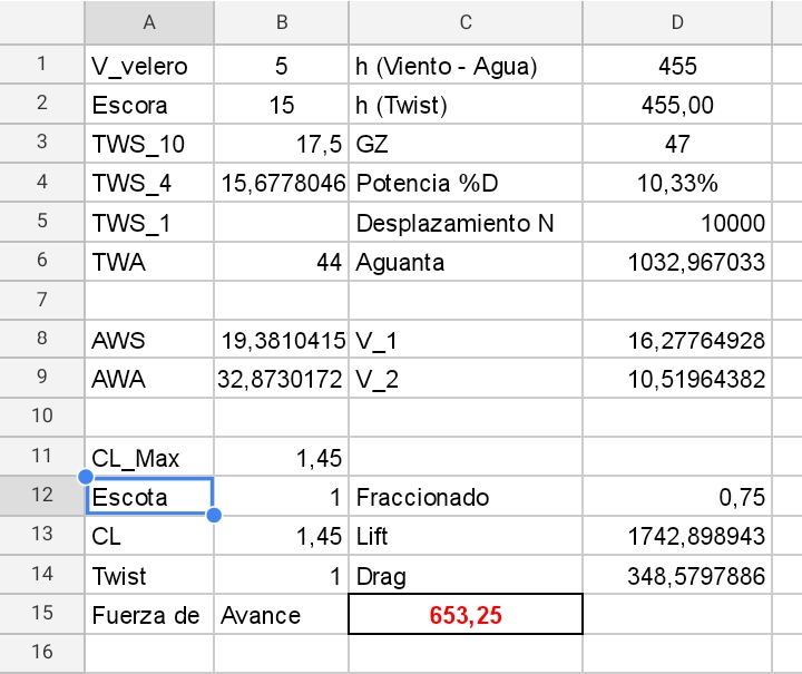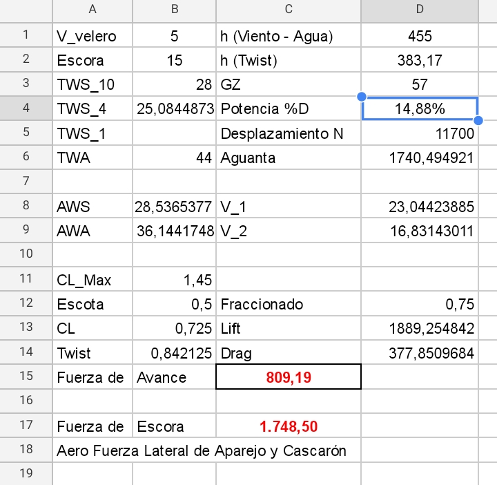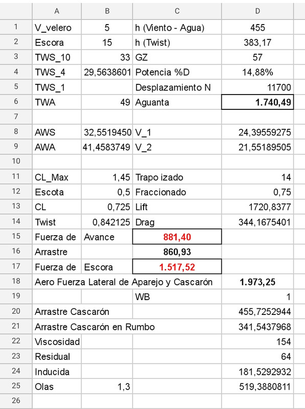 Ahí ... ("Ahí hay un hombre que dice Ay !") Ahí, en ese cálculo, entusiasta cálculo, la torsión/Alabeado (twist) va por un lado ... y el Coeficiente de Sustentación del Aparejo va por otro lado a su aire Twist 0.84 y 1 de Coeficiente, eso no tiene sentido Estos Números hay que trastearlos con Hoja de Cálculo --- A mos a ver Que la calculadora del teléfono puede con esto Hidro_Arrastre @ la Velocidad del Casco (5 nudos): 260 N x 1,1 para tener en cuenta un poco de olita = 286 N Aero_Arrastre del Casco Cascarón: 124 N 410 Newtons Aparejo Fraccionado 3/4 = 0,75 Twist: 0,865 CL (Coeficiente de Sustentación): 0,86 420 Newtons . Editado por U25pies en 24-04-2023 a las 19:00. |