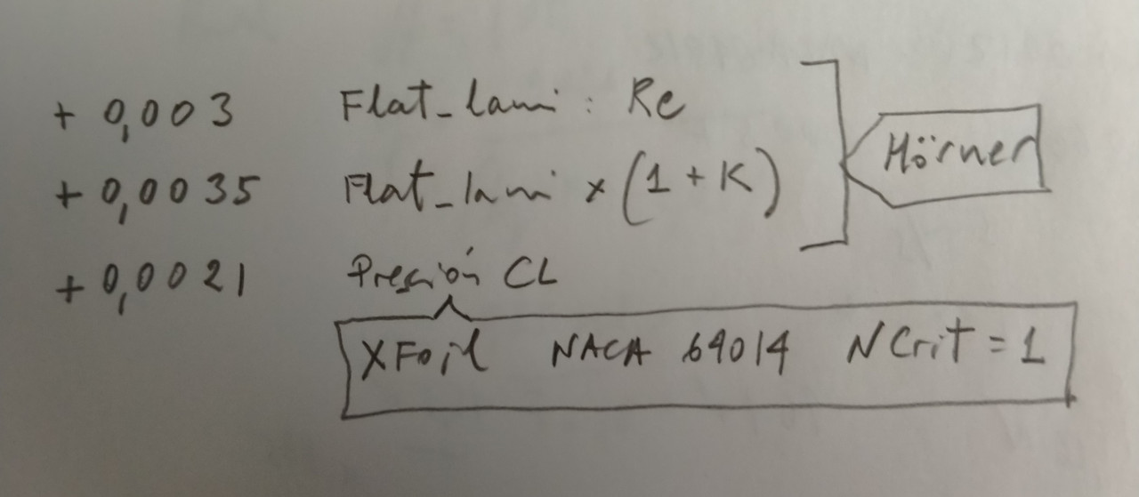 ![]() Coeficiente de Arrastre del Perfil por Viscosidad, según ORC_VPP_2021 Estos tíos echan mano del magnífico ladrillazo del señor Hörner, es decir tecnología alemana de la segunda guerra mundial Y reconstruyen el Coeficiente de Arrastre así + Una Placa Plana con Flujo Laminar que tenga el mismo Número de Reynolds que la Orza/Pala + Turbulencia y Grosor del Perfil + Y luego le suman las diferencias de Presion entre el borde de ataque y el borde de salida lo sacan del programa XFoil del profesor Drela con un perfil NACA 64014 (que se ve que es el que llevan los señores de las regatas) y "NCrit = 1" . Editado por U25pies en 26-04-2023 a las 11:20. |