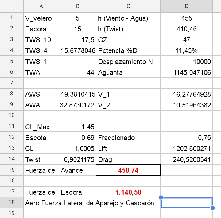 ![]() La "Fuerza de Escora" La Fuerza que Escora al Velero resulta ser el 95% de la Sustentación (Lift) Así que hay menos holgura de lo que pensaba Si sube el viento y nos metemos en la ceñida con viento fresco pues cargamos Agua de Mar en Barlovento ... ... y la Potencia del Bicho expresada en porcentaje del Desplazamiento (%D) subiría hasta alrededor del 15% Que está tremendo aunque los de la Vela Ligera se lo tomen a risa, pues un "Cuatro Setenta" (4 70) con un tipo haciendo Trapecio el bicho tiene una Potencia del 28% de su Desplazamiento Y la cosa ejque la Orza y la Pala (y una migaja que aporta el Casco) tienen que hacerse cargo de tooda la Aero Fuerza Lateral = Suma de la Fuerza de Escora + la Aero Fuerza Lateral en el Casco Cascarón que yo sospecho que está infraestimada . |